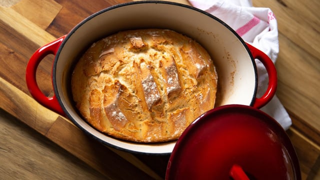 Ne retirez pas le couvercle de la cocotte pendant la cuisson dans le four. Vous pourrez le faire à la fin de la cuisson. Si vous souhaitez que la croûte du pain soit plus colorée, poursuivez la cuisson au four pendant 5 minutes, sans recouvrir la cocotte de son couvercle.