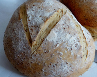 Verser la pâte sur un plan de travail, dégazer puis retravailler en incorporant un max d'air (on plie pour faire des poches), on boule et on laisse reposer de nouveau 1 h (tester avec le doigt). Enfourner avec un bol d'eau bien chaude, th 7 pendant 30 min environ après avoir fariné et incisé.