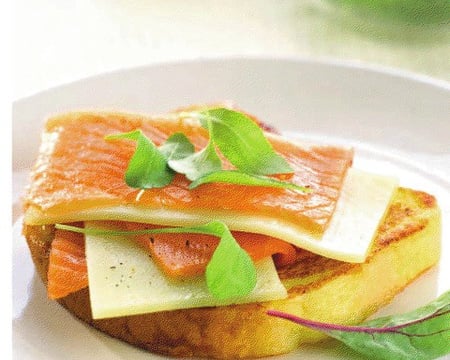 Ajouter ensuite une tranche de saumon (ne pas cuire le saumon fumé aA"57;n de préserver sa saveur) et de Comté.