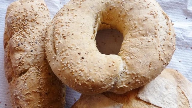 Mettre dans le bol du robot, muni du crochet à pétrir la farine et les graines de sésame. Verser l'eau au fur et à mesure, pétrir pendant 5 min. Laisser lever 30 min puis dégazer.