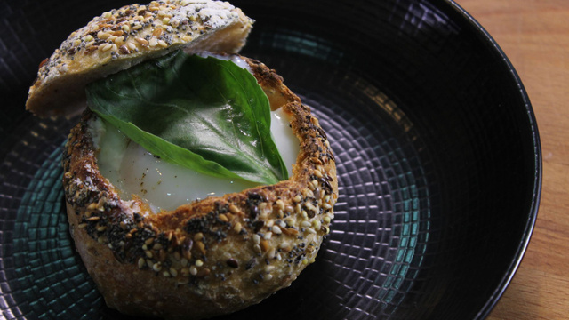 Casser ensuite un oeuf parfait dans chaque pain et assaisonner de sel et de poivre. Décorer avec une feuille de basilic et servir aussitôt avec le chapeau.