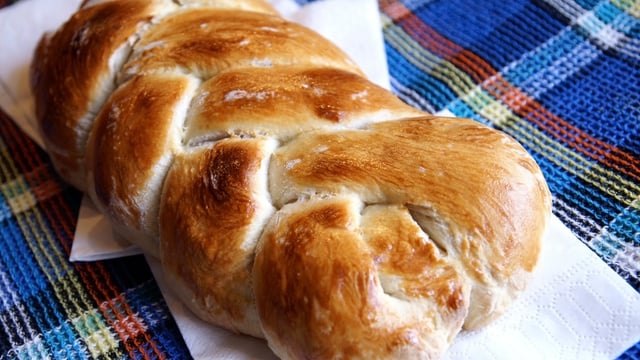 Dégasez la pâte, la diviser en 3 pâtons et tressez. Faites lever 15 minutes.