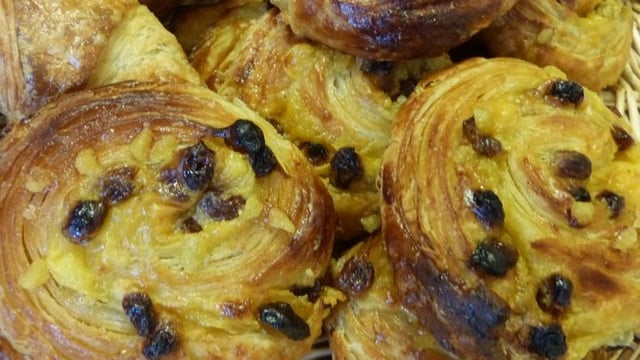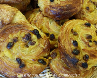 Préparation : Abaisser la pâte d'environ 3 mm, parer (couper) les côtés. Étaler la crème pâtissière sur à peu près 1 à 2 mm d'épaisseur, parsemer de raisins secs, puis rouler la pâte sur elle-même en serrant un peu. Découper des tronçons de 2 cm, filmer et laisser lever 40 min dans une pièce sans courant d'air. Les dorer avec un œuf entier battu. Les mettre à cuire dans un four préchauffé à 180 °C pendant 15 à 20 min, tout dépend de la grosseur des petits pains aux raisins.