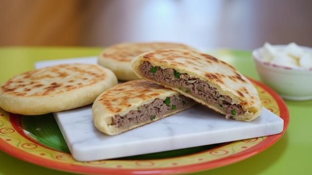 Prendre une portion de pâte, l'étaler en un rond de pâte d'environ 12 centimètres de diamètres et 1 centimètre d'épaisseur. Diviser la farce en 8 boules. Prendre une portion de farce et la poser au milieu de cercle de pâte. Tasser un peu la farce, étirer les bords de la pâte et replier les sur la garniture. Faire ainsi tout le tour afin de recouvrir toute la garniture de pâte, de bien l'emballer. Appuyer ensuite sur le pancake farci avec la main, il doit faire environ 2,5 centimètres d'épaisseur et 8 centimètres de diamètre.