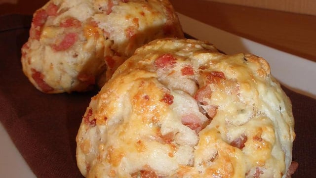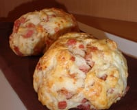 Des petits pains garnis au fromage et aux lardons pour les gourmands. On les emporte en pique-nique par exemple.
