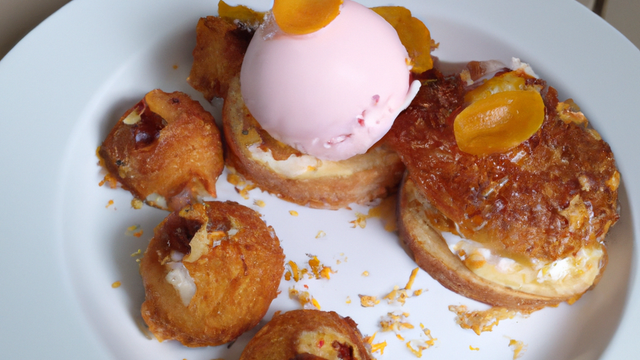 Dressage :- Sur le côté gauche de l'assiette, dresser les pains perdus.- Réaliser un motif avec du chocolat au cornet, puis remplir au centre de coulis caramel abricot.- Disposer en haut de l'assiette le bouchon de champagne puis agrémenter de croustillant à l'amande.