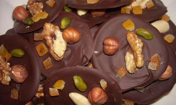 Ajouter les fruits sur le chocolat encore fondu. Et mettre au frigo pour faire durcir. Deguster.