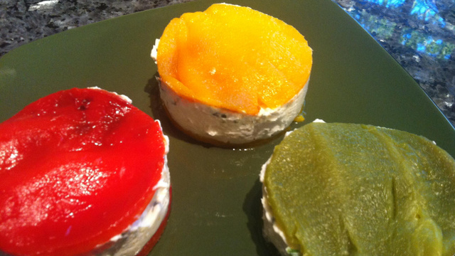 Dans votre emporte-pièce, mettez un premier disque de poivron, recouvrez du mélange de ricotta (environ 2 CS/ palet) et finissez par un disque. Placez les palets au réfrigérateur pendant au moins une heure.