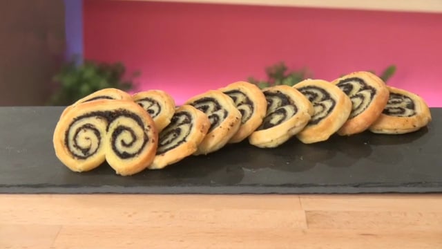 Rouler chaque côté de la pâte feuilletée vers l'intérieur en serrant bien. Découper des rondelles d'environ 1cm et les déposer sur une plaque de cuisson.