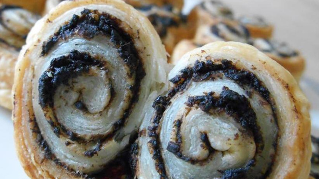Sur la pâte feuilletée,étaler la tapenade noire en couche très fine.