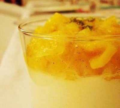 Verser dans les verrines et placer au frais au moins une demie heure avant de verser la compotée au-dessus, et de saupoudrer d'une pincée de zeste de citron vert.