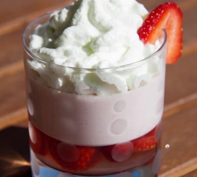 Servir la pana cotta en habit de verveine avec un peu de chantilly sur le dessus et des fraises en décoration. Et surtout régalez-vous !