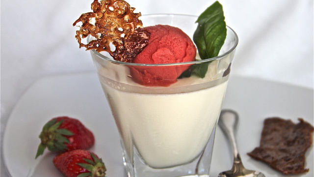 Finition: Poser une boule de glace sur chaque panacotta durci, puis décorer avec une fraise, une feuille de basilic et deux tuiles croustillantes de fraises.