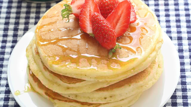 Servez chaud avec des fraises, du Golden Syrup, du miel ou du sirop d’érable.