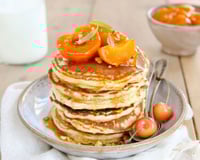 Servir les pancakes accompagnés d’abricots rôtis et arroser avec le jus. Terminer avec quelques feuilles de verveine ciselée.