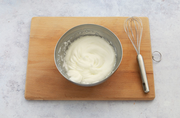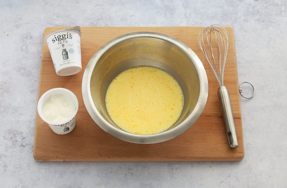 5Dans un autre saladier, fouettez les jaunes d'œufs avec le lait, ajoutez le skyr, fouettez de nouveau pour bien amalgamer le tout.