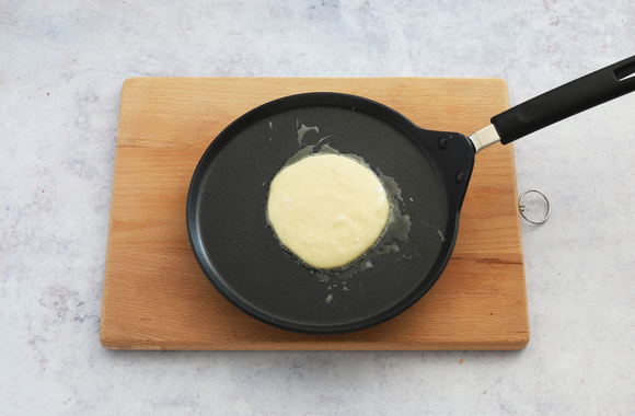 8Faites chauffer une poêle à crêpes avec du beurre sur feu moyen, afin que la pâte soit saisie mais ne colore pas trop. Déposez au milieu une louche de pâte à pancakes.