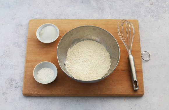 Mettez la farine dans un saladier, ajoutez le sucre, le sel et la levure chimique. Mélangez le tout.
