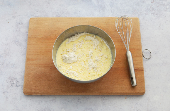 6Versez le mélange liquide peu à peu sur les éléments secs, en mélangeant avec le fouet. Mélangez jusqu'à l'obtention d'une pâte lisse.