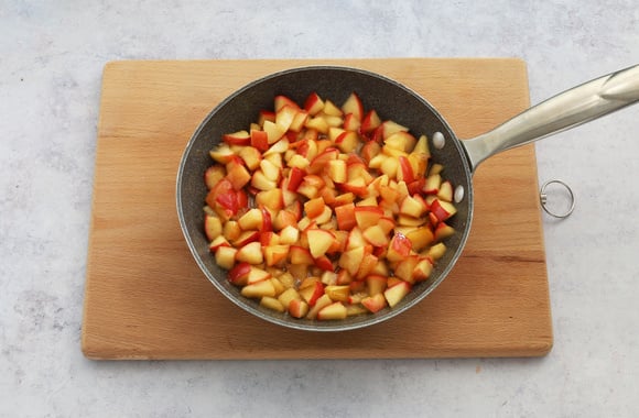 2Dans une poêle, faites fondre le beurre. Ajoutez les dés de pommes et saupoudrez-les avec le sucre de canne. Faites caraméliser 10 minutes en mélangeant de temps en temps.