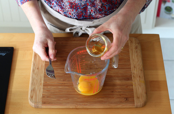4Dans un pichet, versez les jaunes et le rhum.