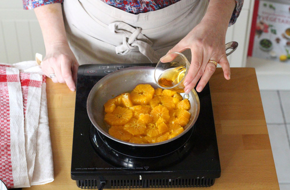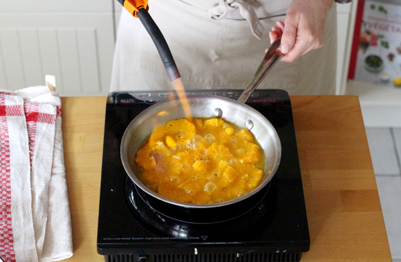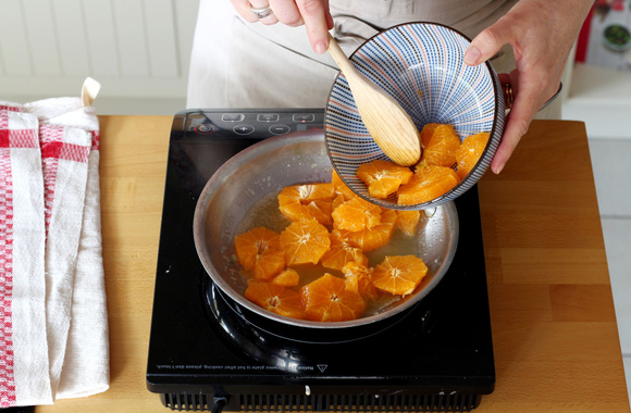 11Faites chauffer le beurre dans une poêle. Quand il mousse ajoutez les clémentines et le jus qui s'est formé.