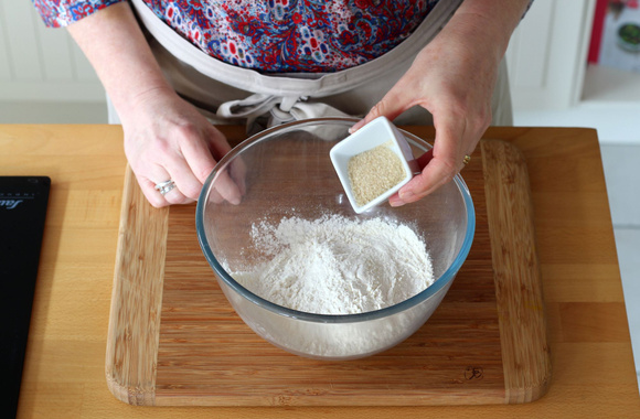 3Dans un bol, versez le sel, la farine, la levure et le sucre.