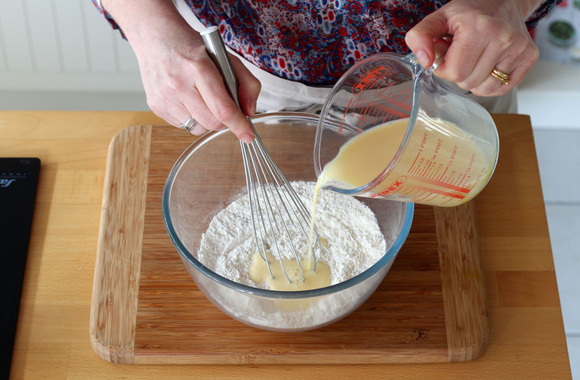 6Versez les liquides petit à petit dans le bol, tout en mélangeant.
