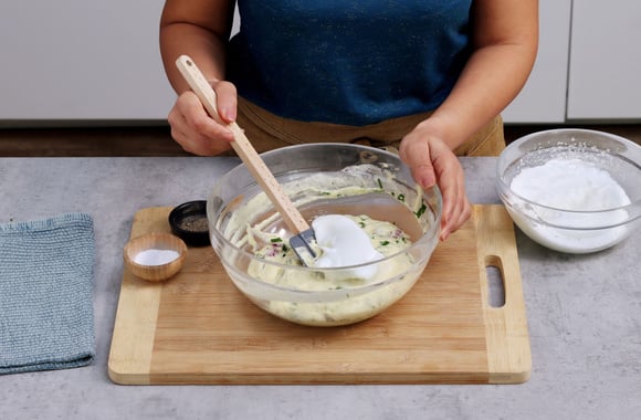 1Dans un saladier, mettez la farine, la levure, le sel et le poivre, mélangez.