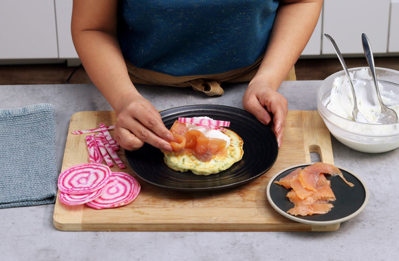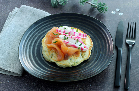 9Dressez les pancakes aux herbes avec la Chantilly salée, des tranches de saumon fumé et quelques bâtonnets de betterave.