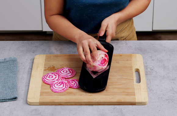 7Lavez la betterave et tranchez-la très finement à l'aide d'une mandoline.