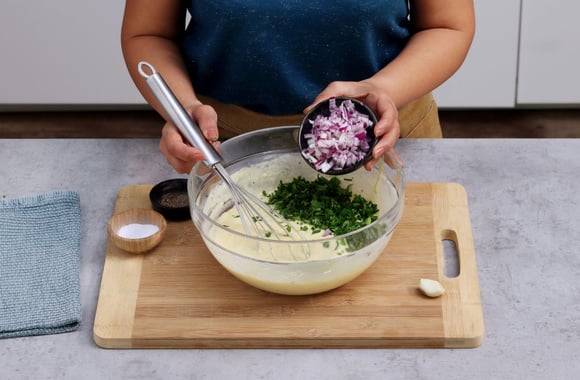 2Ajoutez les herbes, la gousse d'ail et l'oignon émincé, mélangez.