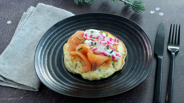 Cette entrée de fête a été réalisée à partir de saumon fumé 100% français ! Élevé et fumé près de Cherbourg par Pascal, il développera toutes ses saveurs, avec ce pancake et une crème montée aux herbes !