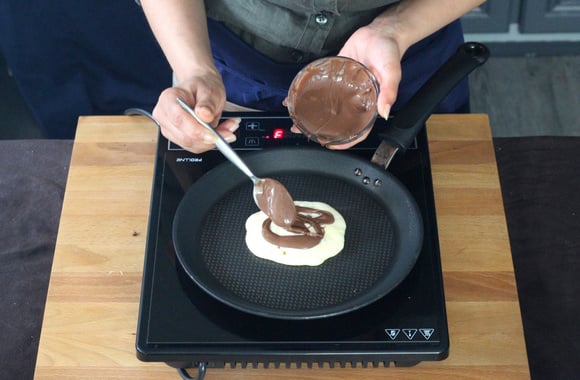 6Versez la moité d'une petite louche de pâte tout en la nappant avec le dos de la louche pour obtenir un rond ou un ovale. Ajoutez 1 cuillère à soupe de pâte à tartiner sur la pâte.