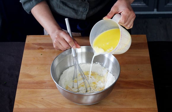 3Faites fondre le beurre dans le lait légèrement tiédi et versez sur le mélange précédent.