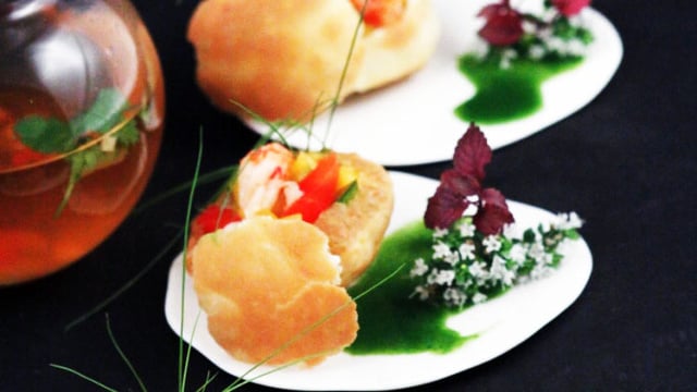 Le principe du pani puri est terriblement convivial puisqu'il suffit de verser un peu de pani (ici un bouillon parfumé) dans le puri et surtout de ne faire qu'une bouchée. Explosion de saveurs garantie