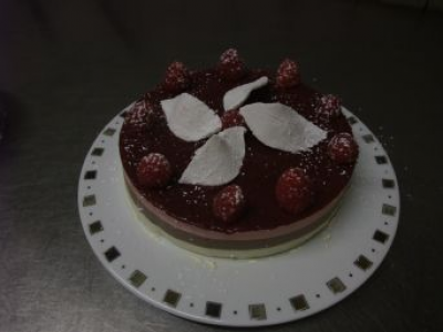Etaler le coulis de framboises et laisser au refrigerateur pendant 2 a 3 heures Démouler et decorer avec les framboises et les feuilles de pastillade.