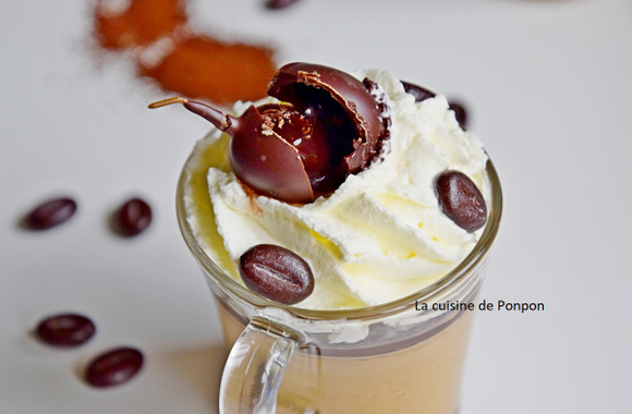 4Avant de déguster, garnir de chantilly, quelques grains de café au chocolat et une griotte au kirsch.