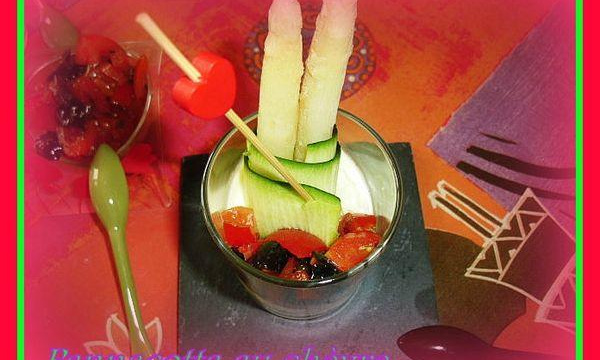 A l'aide d'un économe, découpez 6 fines lamelles dans la courgette. Positionnez deux par deux les asperges puis entourez-les d'une bande de courgette que vous fixerez à l'aide d'un cure-dent. Coupez les olives noires en dés et faîtes de même avec les tomates. Assaisonnez le tout de sel, de poivre du moulin et d'huile d'olive. Au moment de servir, répartissez la garniture sur les panna cotta et dégustez.