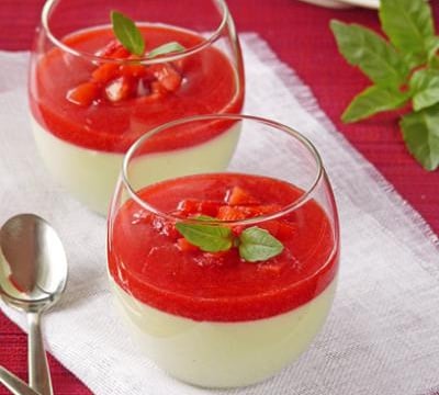 Verser sur chaque panna cotta un peu de coulis de fraise. Ajouter quelques morceaux de fraises et un brin de basilic.