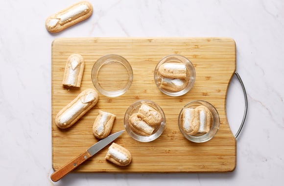 5Coupez chaque biscuit à la cuillère en deux et placez-les au fond de 4 verres de présentation.