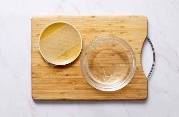 2Faites tremper les feuilles de gélatine dans un bol d’eau froide pendant 10 minutes environ pour les faire ramollir.