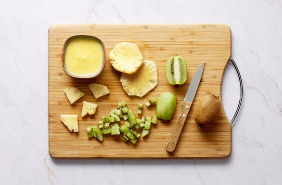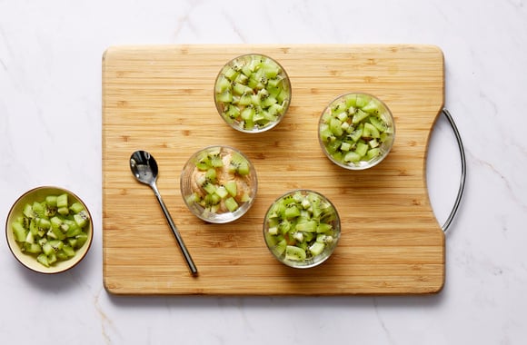 1Epluchez les kiwis et coupez-les en dés.