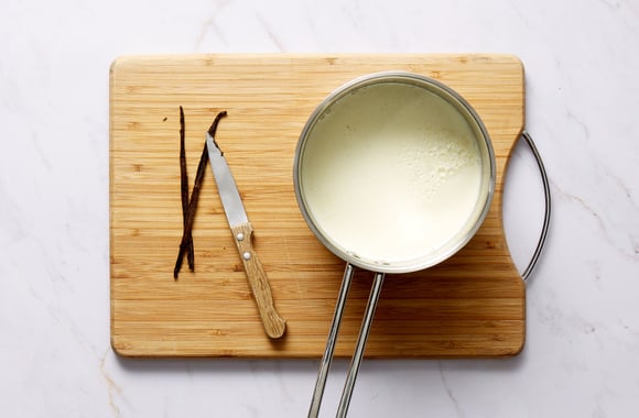 Fendez la gousse de vanille en deux dans le sens de la longueur et grattez les graines à l’aide d’un petit couteau au-dessus de la casserole.