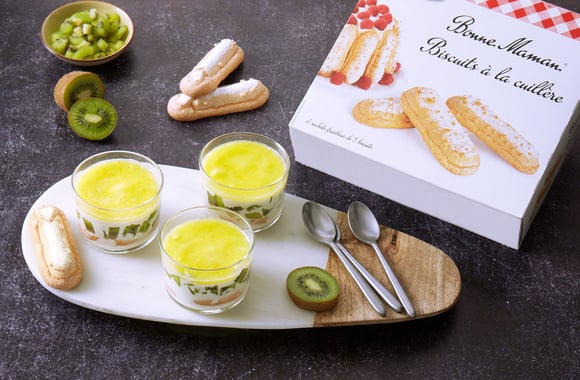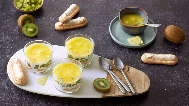 Aujourd'hui, on partage avec vous des panna cotta ultra gourmands avec des biscuits à la cuillère, des kiwis et un bon coulis d'ananas pour plus de gourmandise.