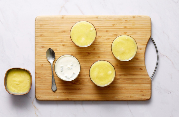 8Après les 4 heures de pause, versez le coulis d'ananas sur la panna cotta.