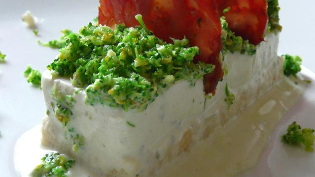 Pour la panna cotta: faites tremper les feuilles de gélatine dans un bol d'eau froide. Faites chauffer la crème liquide et faites-y ensuite fondre le Roquefort à feu doux. Égouttez la gélatine et faites-la dissoudre dans la crème en mélangeant. Coupez le feu. Ajoutez le fromage blanc en fouettant. Laissez refroidir quelques minutes.