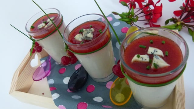 Décorez les verrines de miettes de roquefort et de ciboulette.