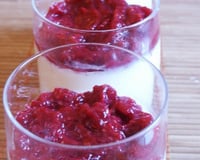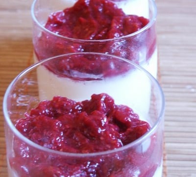 3) Préparez la compote: coupez la pomme en dés et ajoutez dans une casserole les framboises. Une fois cuite, mixez la compote et disposez la au dessus de la pana cotta.