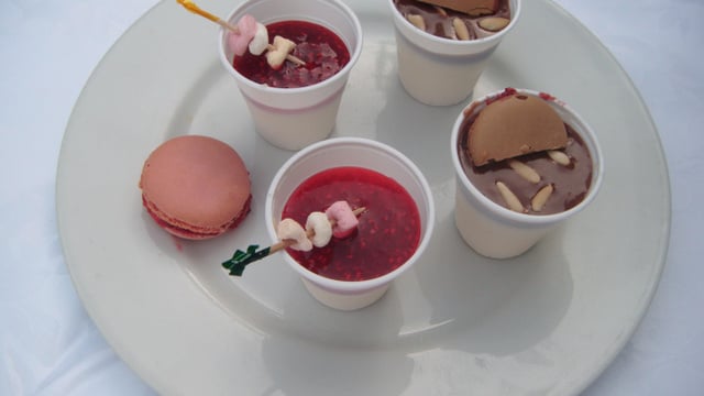 Faire fondre 2 carres de pralinoise 30 seconde au micro onde y mettre un peu de creme fraiche mélanger mettre sur la panna cotta parsemer de pignons pour les autres faire un coulis de framboises en mixant les fruits avec le sucre laisser au froid au moins une nuit.